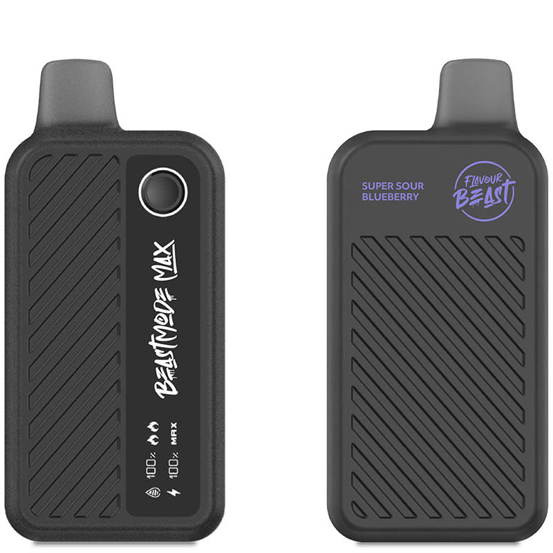 The Super Sour Blueberry flavour Beast Mode Max Disposable Vape by Flavour Beast contains 20mL of e-liquid and is equipped with an 850mAh rechargeable battery, an LED screen, and three power modes. Enjoy up to 18,000 puffs with a single mesh coil at 11W in standard mode, 15,000 puffs with dual coils at 17W in beast mode, or 12,000 puffs with dual coils at 23W in max mode.