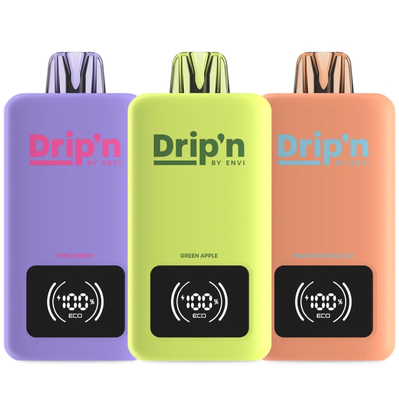 (Read more)The 26mL Disposable Vape from Drip'n by Envi is a value size device that delivers up to 70K puffs of vapor, with an 850mAh rechargeable battery for extended convenience on the go. An airflow slider on the bottom of the device allows you to adjust the restriction between mouth to lung or restricted direct to lung, and the single operating button allows you to switch between Eco Mode firing a single 1.2Ω mesh coil at 9.6W, or Normal Mode firing a 0.6Ω dual mesh coil at 15W for extra vapor. A large screen clearly displays the current firing mode, and after drawing displays the current battery level before switching back to the e-liquid level.