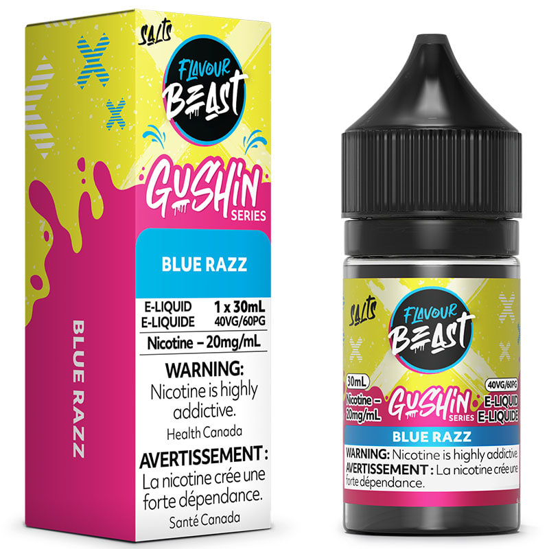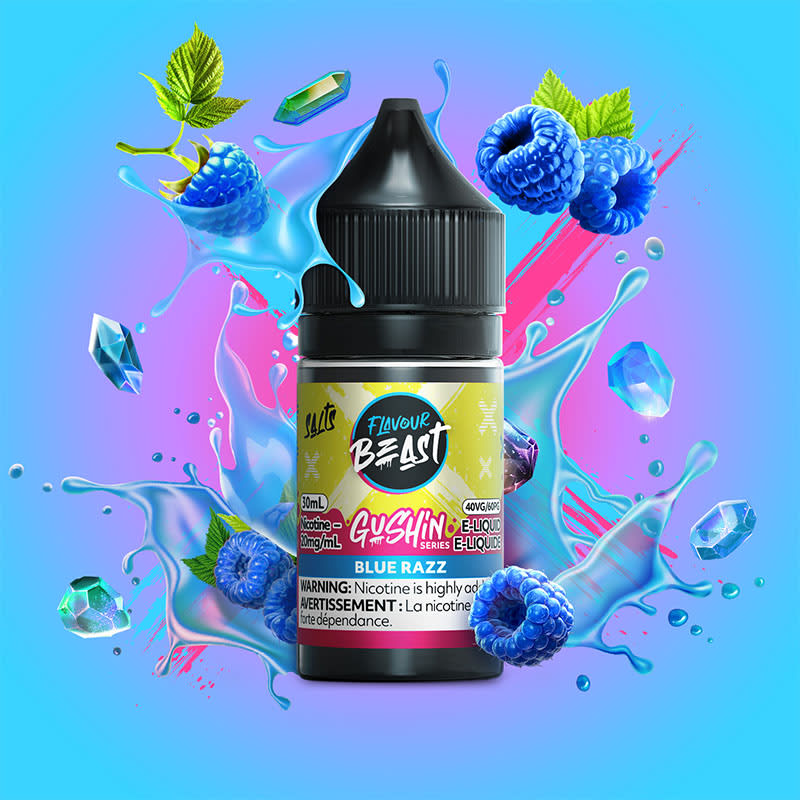 L'e-liquide aux sels de nicotine saveur Gushin Blue Razz de Flavour Beast est disponible en flacons de 30 ml avec 20 mg/ml de sels de nicotine et un ratio VG/PG de 40/60.