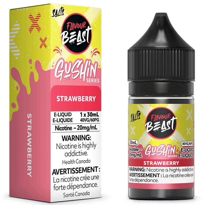 L'e-liquide aux sels de nicotine saveur Fraise Gushin de Flavour Beast est disponible en flacons de 30 ml avec 20 mg/ml de sels de nicotine et un ratio VG/PG de 40/60.